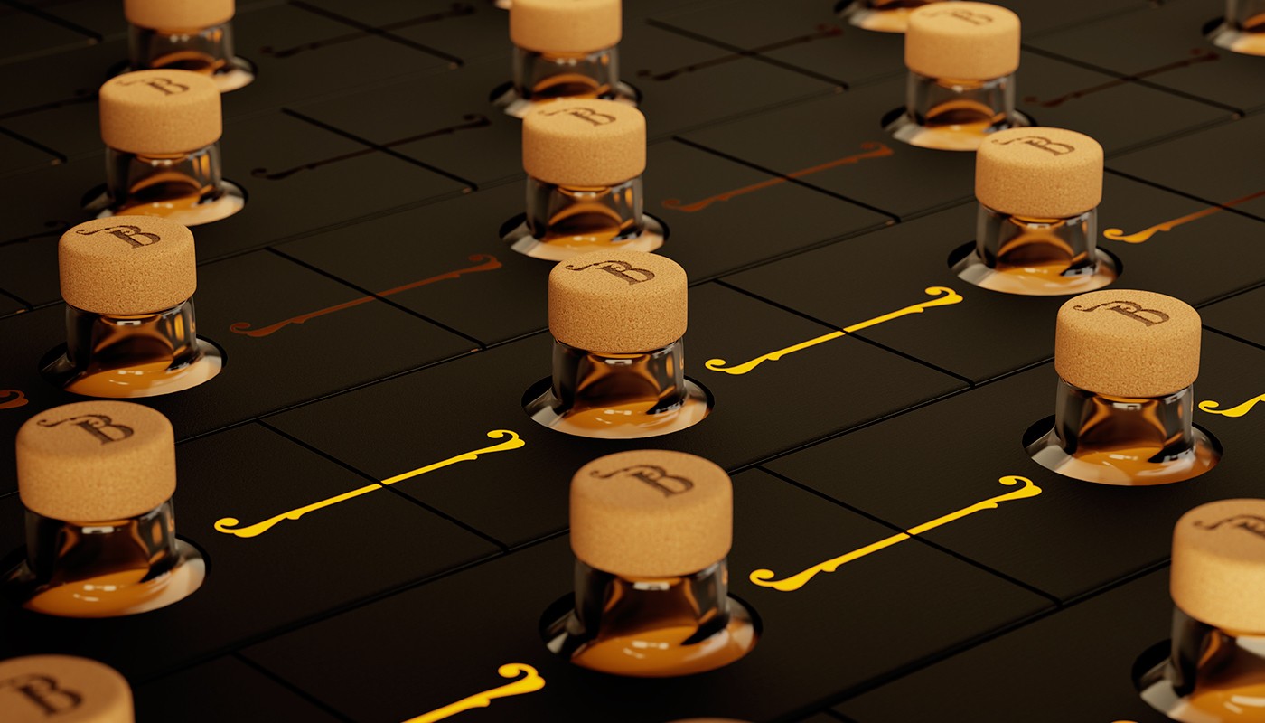 這種蜂蜜實(shí)際上有四種不同的類型;酸木、麥盧卡、橘子和蕎麥。為了使每一個(gè)都與眾不同,我們決定給它們可識(shí)別的顏色;青銅色、金色、銀色和翡翠綠色(按順序排列)搭配閃亮的紫外線,與前面蜜蜂烙印的黑色背景形成強(qiáng)烈對(duì)比,除了對(duì)這種生物的尊重之外,別無其他。