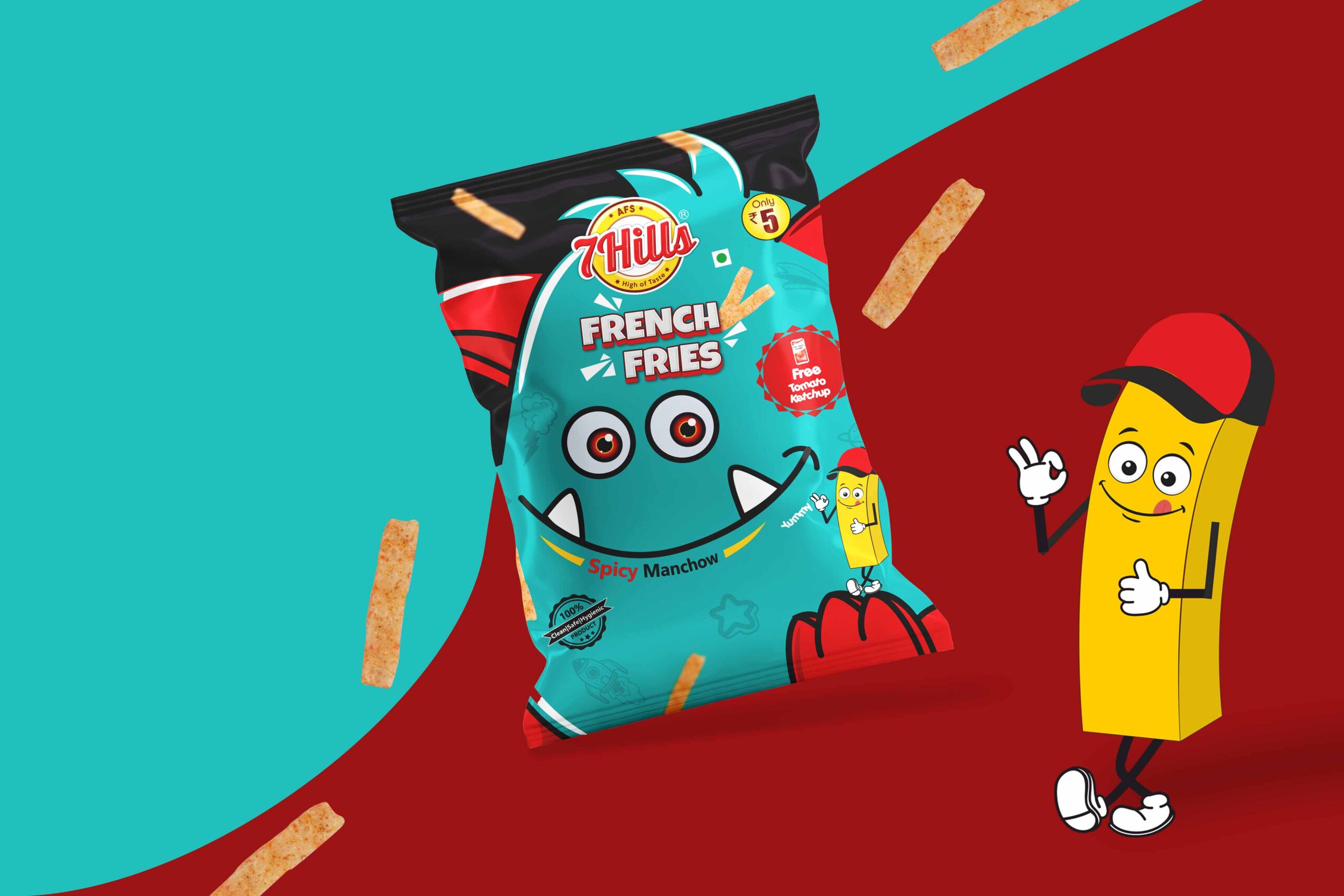 薯?xiàng)l:這包薯?xiàng)l的設(shè)計(jì)考慮到了薯?xiàng)l的辣味。包裝上的人物是一根薯?xiàng)l,戴著一頂可愛的帽子,這是通過繪畫創(chuàng)作的。這個(gè)設(shè)計(jì)的中心人物是水色的。