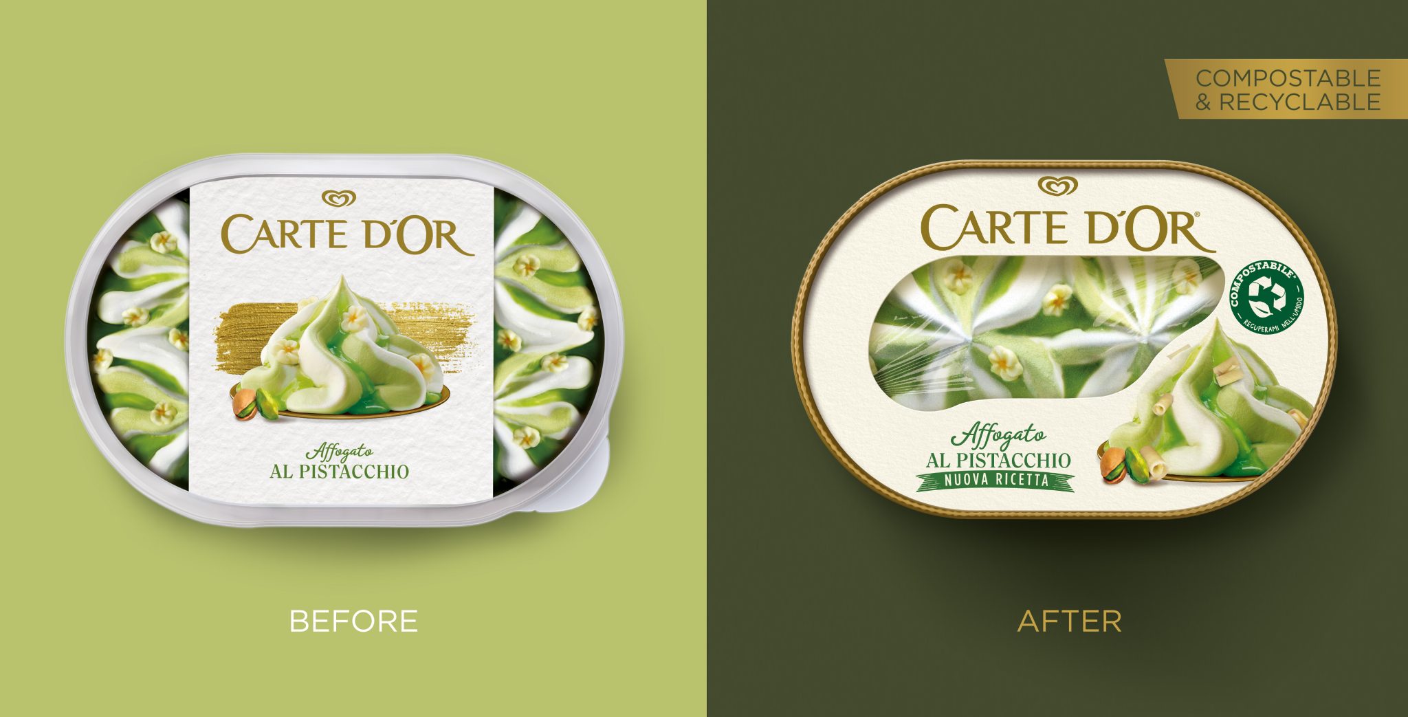 Carte D‘Or是意大利桶裝冰淇淋領(lǐng)域的領(lǐng)先品牌,其龐大的產(chǎn)品組合每年代表2500萬件塑料包裝產(chǎn)品(1200噸這種材料)。2021年,該品牌將Carte D‘Or Affotion系列的包裝從塑料改為100%可堆肥和可回收紙張。