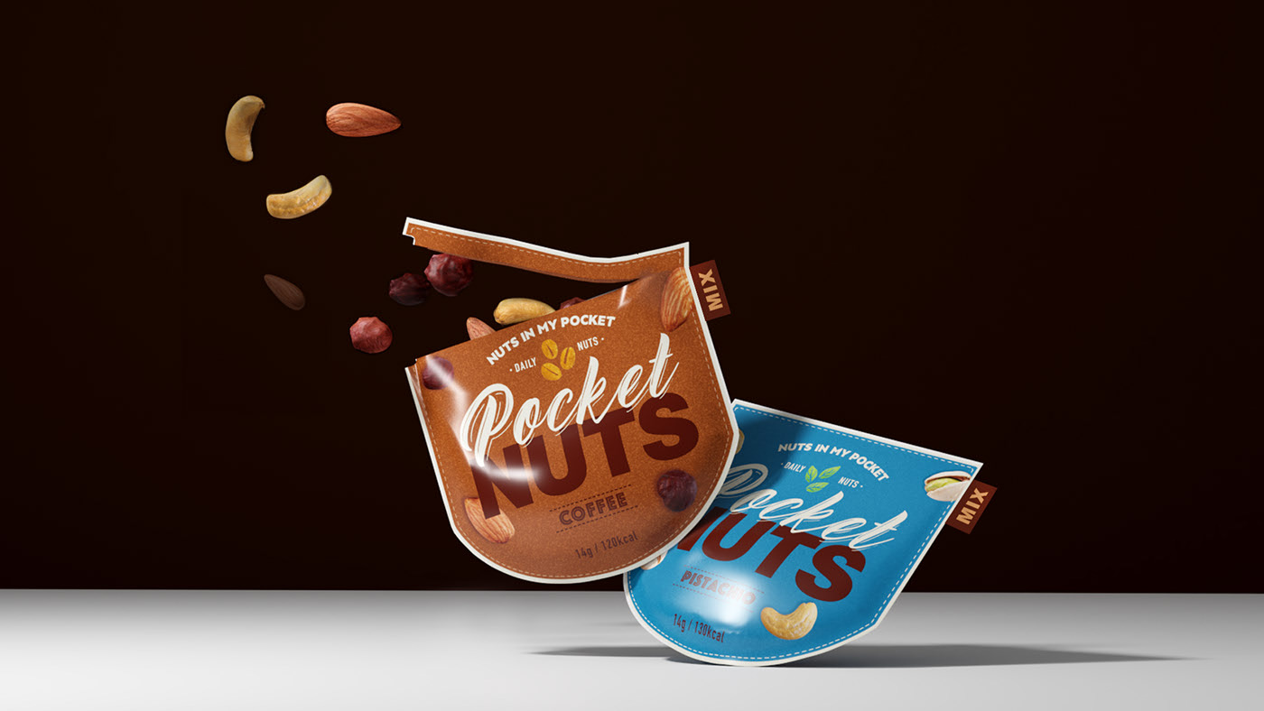 口袋堅果是一種日常牛仔褲包裝,以牛仔褲口袋的概念制成。